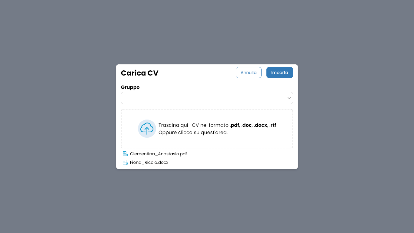 Cliccando sul tasto Carica CV (si trova nella parte superiore della tabella) si apre la schermata per selezionare il/i CV da caricare.