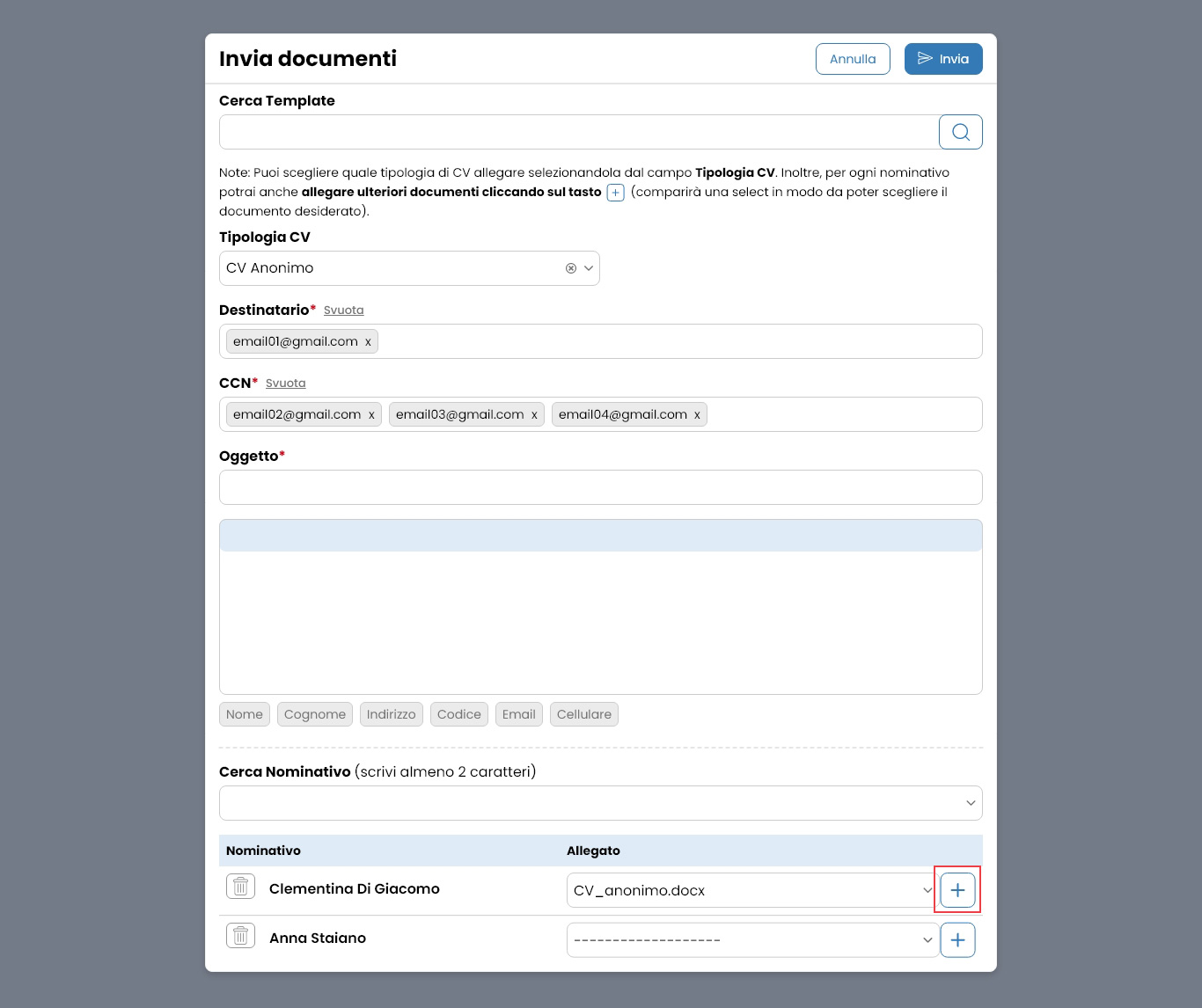 Tramite la funzionalità Invia documenti tramite Email (che si trova nelle Azioni Massive) puoi scegliere quale tipologia di CV allegare alla mail e inviarla a uno o più persone contemporaneamente.
