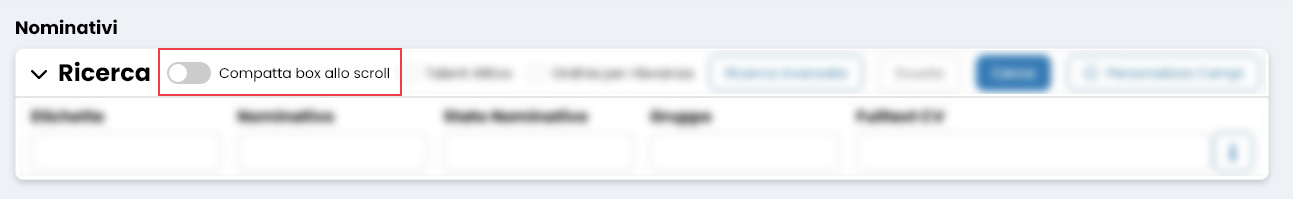 Lo stato di default dello switch compatta allo scroll (si trova nel box di ricerca, alla destra del titolo) è impostato sull'attivo, ciò significa che allo scroll verso il basso dei dati in tabella, il box della Ricerca si chiuderà automaticamente e si aprirà nuovamente allo scroll verso l'alto.